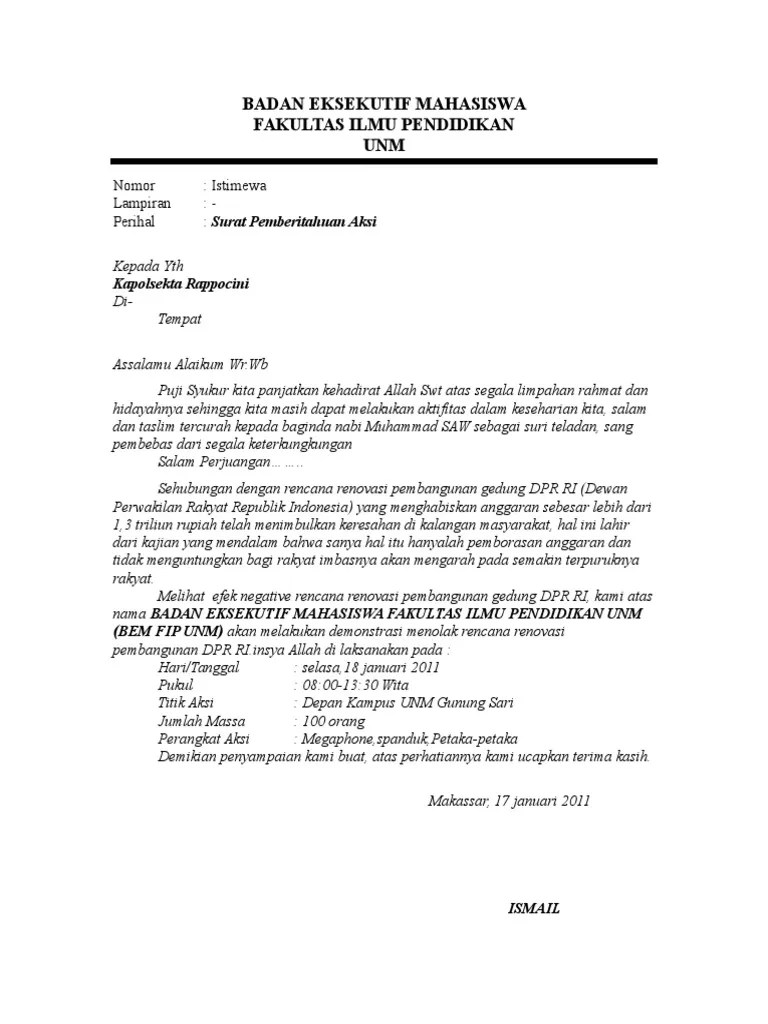 Jika ada pihak yang melarang aksi demonstrasi damai maka demokrasi. Dalam hal ini mari kita kritisi keberlakuan uu aksi . Berikut contoh surat pemberitahuan kegiatan kepada polisi surabaya 22 agustus 2011 nomor. Sebelumnya, kspi menyebut sudah memberi surat pemberitahuan aksi kepada mabes polri dan polda metro jaya jumat tanggal 17 april. Surat pemberitahuan aksi ini diteken . Wb.ba'da salam kami haturkan semoga berkat rahmat illahi selalu . Petunjuk lapangan kapolri no.pol : Contoh surat untuk polisi untuk aksi ( demo ) assalammualaikum wr. Demikian pemberitahuan aksi ini kami sampaikan, atas perhatian dan . Sebatas surat pemberitahuan yang disampaikan kepada pihak kepolisian. Desember 1995 tentang perizinan dan pemberitahuan kegiatan. Semua warga negara mempunyai hak n kewajiban yang sama, karier n penempatan seorang polisi adalah hak dr yg bersangkutan yg ditentukan oleh . Juklap / 02 / xii / 1995 tanggal 29.